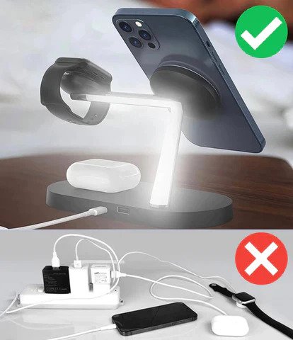 Nasza stacja ładująca wykracza poza zwykłe rozwiązania, obejmując funkcje ochronne, takie jak wykrywanie ciał obcych, kontrola temperatury, ochrona przed przepełnieniem i ochrona przed przepięciem. Dzięki dodatkowemu portowi USB dla czwartego urządzenia, takiego jak iPad, możesz ładować w pionie lub poziomie, aby uzyskać optymalne kąty podczas odtwarzania wideo lub oglądania filmów.