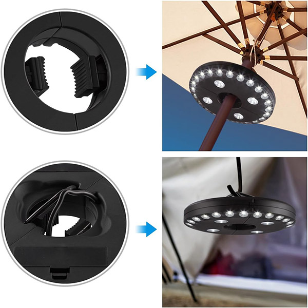 W przeciwieństwie do standardowych lamp do parasoli, BRELLAGLO działa tam, gdzie tego potrzebujesz. Przymocuj do parasola, aby oświetlić patio, lub użyj wbudowanych haczyków do zawieszenia—idealna na kemping i przygody na świeżym powietrzu.