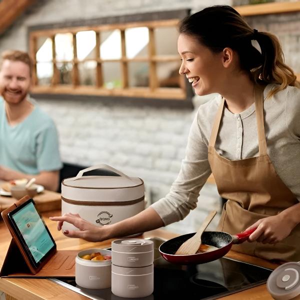 Ciesz się ciepłymi domowymi posiłkami, gdziekolwiek jesteś, dzięki temu wielowarstwowemu zestawowi pojemników na żywność.